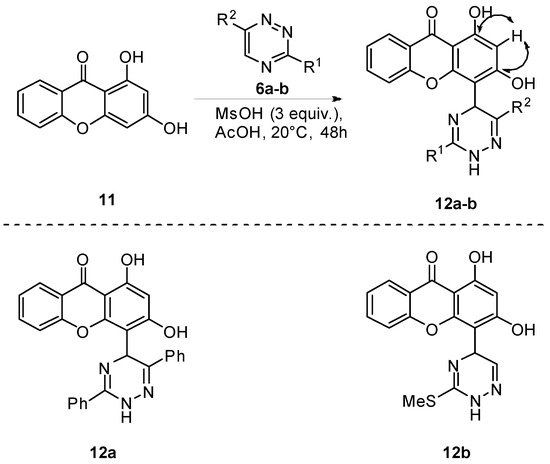 In acetic acid (10 mL), 1,3-Dihydroxy-9H-xanthen-9-one 11 (228 mg, 1.0 mmol), 1,2,4-triazine 6a,b (1.1 mmol), and methanesulfonic acid (288 mg, 3.0 mmol) were dissolved and the mixture allowed to stand for 48 h. The mixture was poured in water and quenched with an NaHCO3 solution, and the precipitate was filtered and recrystallized from ethyl acetate yielding pure 12a,b.