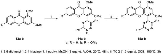 In acetic acid (10 mL), 1,3-Dimethoxy-9H-xanthen-9-one 13 (1.0 mmol), 1,2,4-triazine 6a (233 mg, 1.1 mmol), and methanesulfonic acid (288 mg, 3.0 mmol) were dissolved and the mixture allowed to stand for 48 h. The mixture was poured in water and quenched with NaHCO3 solution, and the precipitate was filtered and recrystallized from ethyl acetate yielding pure 14a–b.
