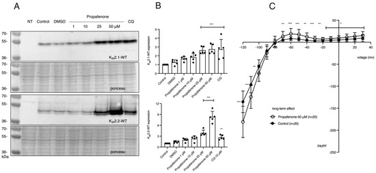 Next, the long-term effects of propafenone on IK1 and KIR2.1 and KIR2.2 protein expression were explored. Figure 1A,B show that propafenone can increase the expression levels of KIR2.1 and KIR2.2 proteins dose-dependently. To see whether the increased protein levels observed by western blot would also result in increased expression levels on the membrane and KIR2.1-carried current, we treated HEK-KWGF cells with 50 μM propafenone for 24 h and analyzed them immediately for IK1 current densities in the absence of propafenone (Figure 1C). Long-term treatment of the cells with propafenone significantly increased both the inward component of IK1 at membrane potentials between −120 and −100 mV and the outward component at membrane potentials between −70 and 30 mV.