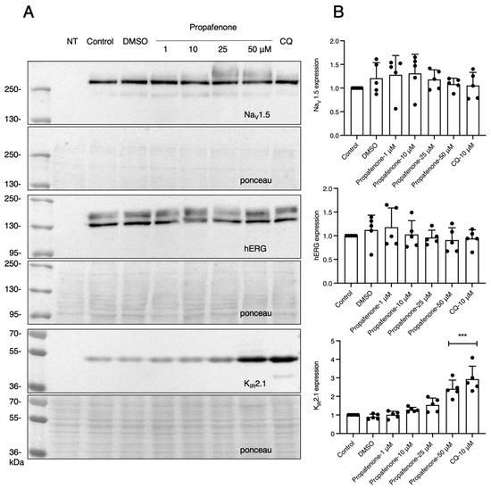 Propafenone specificity for KIR channels. (A) Western blot analysis of hERG channel protein, sodium channel protein, and KIR2.1 channel protein expression levels. Kv11.1 is a voltage-activated potassium channel expressed as a core N-glycosylated immature form (~135 kDa) and a fully N-glycosylated mature form (~155 kDa) in HEK-hERG cells [39]. Nav1.5 is a voltage-activated sodium channel expressed as a single band (~250 kDa) in the HEK-Nav1.5 cells [40]. Cells were treated with different concentrations of propafenone (1, 10, 25, and 50 µM) for 24 h (n = 5). Non-transfected cells (NT) were used as a negative control. (B) Summarized results of (A) (n = 5). The control protein level was set at 1 after correction for loading. Ponceau staining was used as a loading control. *** p < 0.001 vs. control.