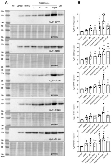 Channel function does not affect the changes in expression of KIR2.1 proteins in response to propafenone. (A) KIR2.1 expression of cells after being treated with different concentrations of propafenone (1, 10, 25, and 50 µM) for 24 h (n = 5). (B) Summarized results of KIR2.1 expression in control and cells treated for propafenone (n = 5). The control protein level was set at 1 after correction for loading. Non-transfected cells (NT) were used as a negative control. Ponceau staining was used as a loading control. * p < 0.05, ** p < 0.01, *** p < 0.001 vs. control of propafenone.