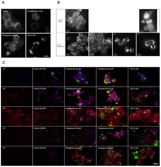 CHO-KD cells were used to investigate whether propafenone’s long-term effect is late endosome/lysosome-related. KIR2.1-Dendra2 is present in round clusters in the interior of the cells, which accumulate inside cells upon administration of 25 μM propafenone (3–48 h) (Figure 6B). Images of DMSO-treated cells (Figure 6B) show that KIR2.1-Dendra2 is present in the plasma membrane and the cell’s interior as many little clusters. Time-lapse imaging (Video S1, CHO-KD cells treated with DMSO) shows that these clusters move fast in all directions. KIR2.1-Dendra2 moves slower after being treated with propafenone, and big clusters appeared in the cells’ interiors (Video S1). The number of small clusters decreased (Video S1, CHO-KD cells treated with 25 µM propafenone for 3 h, 6 h, 24 h, and 48 h), and more and larger clusters became visible in the cells. Video S1 shows that the larger clusters of KIR2.1-Dendra2 display less movement, while the remaining small clusters move faster. For the cells treated for 48 h with propafenone, multivesicular bodies (MVBs) appeared among the clusters of proteins (Figure 6B, enlarged picture), indicating that KIR2.1-Dendra2 might accumulate in late endosome-like structures. Similarly, as seen for protein expression levels (Figure 5), intracellular KIR2.1 protein accumulation was independent of D172H, D172R, E244A, E299A, or R312H mutations (Figure 6C).