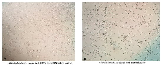 Morphological changes of G. duodenalis exposed to metronidazole: normal architecture of Giardia ((A); 0.25% DMSO (Negative control)) compared with degenerated Giardia ((B); metronidazole) were observed.