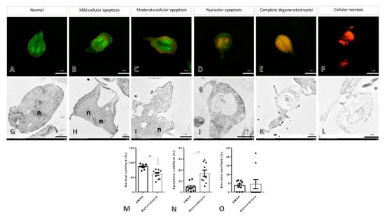 The morphological and ultrastructural changes in Giardia after treatment with metronidazole and 0.25% dimethyl sulfoxide. The different stages of the parasite were characterized by acridine orange/ethidium bromide staining (A–F), normal cells with whole green cytoplasm and nucleus (A), mild to moderate cellular apoptosis with diffused increasing orange in the cytoplasm ((B,C), respectively), nucleolar apoptosis to complete degenerative nuclei with orange nuclei until the entire cell is orange colored ((D,E), respectively), and necrosis with red cells (F). Ultrastructural changes in the parasite were demonstrated by electron microscopic study (G–L), intact cell (G), vacuolated degeneration ranging by low, moderate, and high severities and loss of normal cellular architecture (H–K), and complete loss of normal cellular components (L), the bar graphs comparing the number of normal, apoptosis, and necrosis cells in any treatment (M–O). n: nucleus, **: p-value < 0.01.