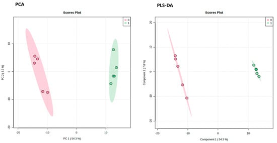 Pairwise analysis of metabolomic data using principal component analysis (PCA) and partial least squares–discriminant analysis (PLS-DA). Red and green represent the data from the control and metronidazole treatments, respectively.