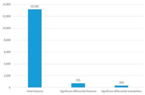 The outcomes demonstrated that the G. duodenalis metabolite profile following treatment with metronidazole differed from that of the control. The mass spectrometric analysis allowed for the observation of 13,162 distinct features. After exposure to metronidazole, G. duodenalis showed differences in 725 features. The METLIN database identified 350 of these metabolites (Figure 4).