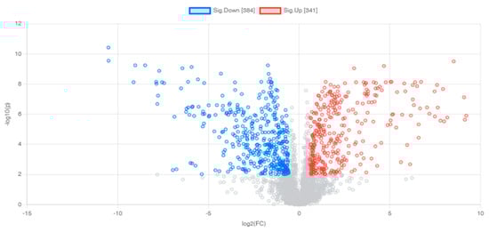A volcano plot was created to display statistical significance (p-value) vs. the degree of change (fold change), as shown in Figure 5. After exposure to metronidazole, 725 differential features were used for p-value 0.01 and folded change 1.5. Around 341 features were up-regulated, and 384 were down-regulated. Following metabolite identification using the METLIN database, there were 193 up- and 211 down-regulated metabolites (Table 1, Table 2 and Table S1).
