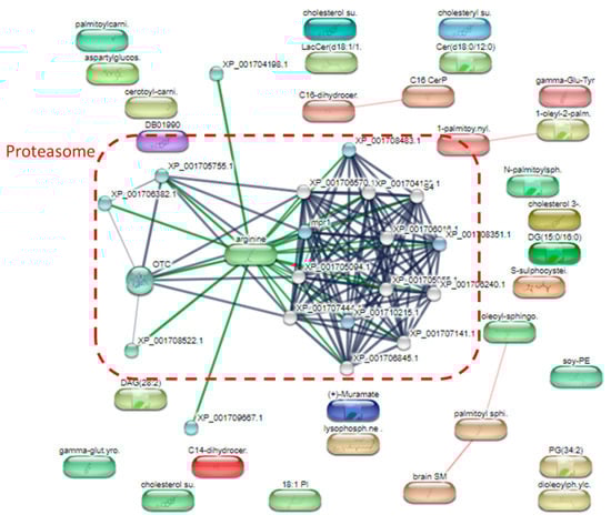 The most up-regulated metabolites following treatment with metronidazole were squamosinin A, octacosanal, and acarbose, as measured by the fold change. In addition, several sphingolipids were also up-regulated after metronidazole exposure; for example, Cer(d18:0/12:0), GlcCer(d16:1/23:0), Cer(d18:0/12:0), LacCer(d18:0/22:0), and Cer(d18:0/14:0). The most down-regulated metabolites after treatment with metronidazole were N-(2-hydroxyethyl)hexacosanamide, C-8 ceramine, and amotidine sulfoxide. Phopholipids were also down-regulated after metronidazole exposure such as PG(12:0/21:0) and PC(22:6(4Z,7Z,10Z,13Z,16Z,19Z)/22:6(4Z,7Z,10Z,13Z,16Z,19Z))[S]. The STITCH bioinformatics tool performed pathway analysis on the different metabolites (Figure 6). Proteasome metabolism was a crucial pathway for differential metabolites.