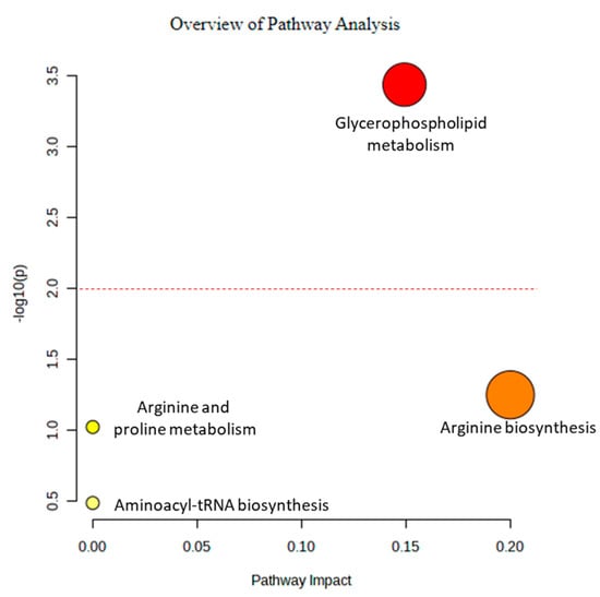 Further detailed analysis of the pathways of the altered metabolites was performed using MetaboAnalyst (Figure 7). The findings indicated that glycerophospholipid metabolism was a prominent mechanism involved with the altered metabolites. Therefore, glycerophospholipid metabolism might be a potential pathway for drug development.