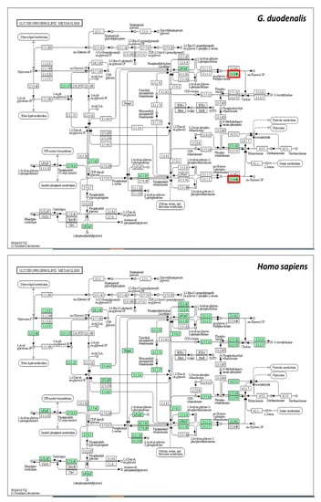 Since glycerophospholipid metabolism was the most significant pathway affected by metronidazole, this pathway from G. duodenalis and Homo sapiens was compared using the Kyoto Encyclopedia of Genes and Genomes pathway database (Figure 8). According to the results obtained, glycerophosphodiester phosphodiesterase (EC:3.1.4.46), shown in red square in Figure 7, plays a role only in G. duodenalis glycerophospholipid metabolism. In contrast, glycerophosphocholine phosphodiesterase GPCPD1 (EC:3.1.4.2) plays a role in H. sapiens glycerophospholipid metabolism. The sequence similarity between G. duodenalis and H. sapiens is only 24.38%. G. duodenalis glycerophosphodiester phosphodiesterase might be a potential drug target for treating giardiasis.