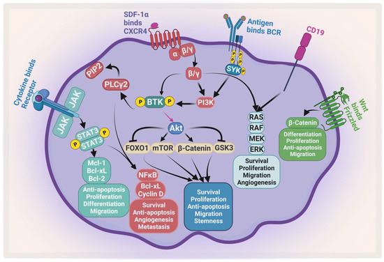 One of the essential kinases that is important during B-cell development is BTK, which belongs to the Tec family of kinases. BTK is shown to be overexpressed and activated in MM stem-cell-like cells [211]. BTK is activated by different pathways including B-cell receptor (BCR), toll-like receptor, chemokine, and Fc receptor signaling pathways [212]. When activated, it translocates from the cytosol to the cell membrane and gets phosphorylated by one of the members of the spleen tyrosine kinase (SYK) or Src family kinases on the tyrosine residue at position 551 (Y551) [213]. Then, an autophosphorylation occurs on tyrosine at position 223 (Y223). The activation of BTK stimulates several downstream signals that are associated with survival, proliferation, drug resistance, and migration.