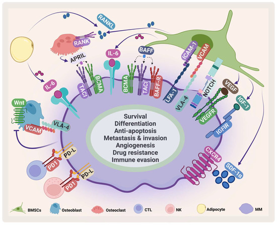 Other cytokines and growth factors secreted from BMSCs suppress the immune response and facilitate MM immune evasion. One of the most important cytokines in MM is IL-6, which is secreted by different BM cells including BMSCs, osteoclasts, and macrophages [31]. IL-6 secretion stimulates the JAK/STAT3 pathway, which leads to increased survival and proliferation through the upregulation of Mcl-1, Bcl-xL, Bcl-2, c-Myc, and cyclin D1 [32,33,34,35]. As MM progresses, osteoclast activity increases, which in turn causes bone lesions. During disease progression, an imbalance occurs in receptor activator of NF-κB ligand (RANKL), and osteoprotegerin [36].