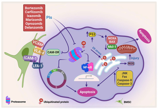 PIs kill myeloma cells through different pathways (Figure 3). Inhibition of proteosomes leads to the accumulation of ubiquitinated proteins that would otherwise be degraded in the proteosome. This leads to the accumulation of these proteins in the endoplasmic reticulum (ER), which in turn causes ER stress, which leads to ER stress-dependent apoptosis and activation of the Jun amino-terminal kinases (JNKs) pathway, increasing the Fas ligand, caspase 8, and caspase 3 [82,83]. Furthermore, mitochondrial injury occurs due to the direct effect of ubiquitinated proteins and the indirect effect of the ER stress that releases reactive oxygen species (ROS) [84]. The direct apoptosis effect of PIs can also occur through accumulation and phosphorylation of P53, which stimulates pro-apoptotic proteins such as Bcl-2-associated X protein (Bax), NADPH oxidase activator (NOXA), cytochrome-c release, and inhibition of the antiapoptotic protein Mcl-1 [85,86].