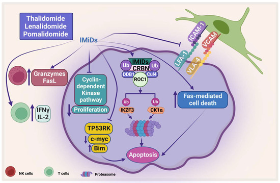 The treatment of IMiDs helps in restoring the immune homeostasis. Several mechanisms have been proposed for IMiDs-mediated immune restoration, for example thalidomide stimulates the proliferation of T-cells and increases the secretion of interferon-gamma (IFN-γ) and interleukin-2 (IL-2) [103,104]. Along these lines, lenalidomide has been shown to stimulate T-cell-mediated cytotoxicity, induction of T-cell proliferative responses to allogeneic dendritic cells, and suppresses expression of programmed cell death protein-1 (PD-1) [105,106]. In addition, lenalidomide and pomalidomide suppress forkhead box P3 transcription factor and T regulatory cell expansion [107]. Moreover, lenalidomide enhances the expression of Fas ligand on NK cells and increases granzyme secretion which correlates to an increase in Ab-dependent cellular cytotoxicity (ADCC) [100]. Lenalidomide and pomalidomide inhibit the expression of adhesion molecules and inhibit the RANKL/osteoprotegerin ratio, which leads to inhibition of osteoclast formation [108].