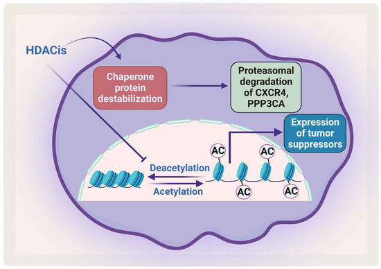 Removal of the acetyl group from the lysine residue on histone by HDACs causes transcription repression (Figure 5). HDACs affect different proteins via deacetylation either directly or indirectly by affecting the function of the chaperone protein that is needed for their stabilization. HDACs cause hyperacetylation and therefore destabilization for the chaperone protein heat shock protein 90 (HSP90), which inhibits its association with CXCR4 leading to proteasomal degradation of CXCR4 in acute myeloid leukemia (AML) cells [112,113]. HDACs also cause degradation of protein phosphatase 3 catalytic subunit alpha (PPP3CA), which is overexpressed in MM, and patients show poor prognosis when it is overexpressed. As HDAC6 plays an important role in the aggresomal protein degradation, its inhibition significantly synergizes with proteasomal inhibition in MM [114]. Hideshima et al. have shown that a selective HDAC6 inhibitor increased the cytotoxicity of bortezomib in vitro and overcame its resistance through JNK activation and ER stress [115]. In 2015, panobinostat was approved for treatment of RRMM patients in combination with dexamethasone. HDAC inhibitors (HDACis) have been shown to affect the acetylation of histone and non-histone proteins; they therefore affect different cell processes including apoptosis, survival, angiogenesis, and the cell cycle [116,117].