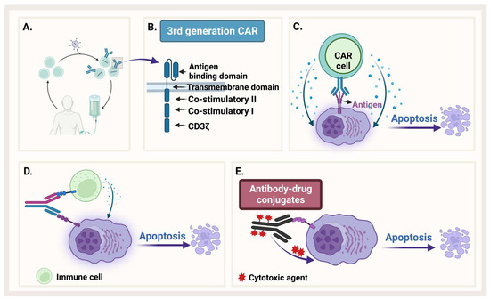 Immunotherapy. (A) Generation of CAR-T. (B) The different generations of CAR-T. (C) CAR-T recognizes an antigen on MM and causes apoptosis. (D) Bispecific antibody binds both MM and an immune cell. (E) Antibody–drug conjugate recognizes MM and releases cytotoxic agent. Created by Biorender.com.
