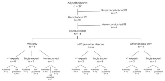 Flow chart overview of all participating MPS clinicians with regard to previous know-how and implementation of ITTs. Out of the 27 experts, 20 had already heard about ITTs and 14 had conducted ITTs—either with MPS patients or MPS and another disorder or only other disorders. A “single expert” is defined as a standalone expert, while “>1 expert” means a kind of interdisciplinary expert team.
