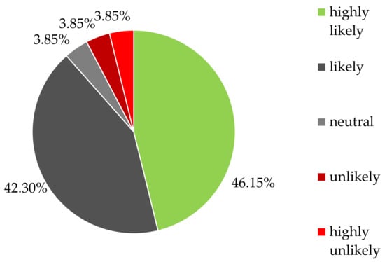 The final survey question was related to an evidence-based DAF tool. Participants were asked to consider a scenario in which a free service exists to make data-driven treatment choices available more easily and on a rational basis in order to offer ITTs to selected MPS patients. Subsequently, the enrolled clinicians were asked if they would use this novel DAF tool to carry out at least one ITT per year. The vast majority, 88.46% (n = 23), were either highly likely or likely to use a service like this. Two physicians (7.69%) indicated that they would rather not perform ITTs despite the availability of a DAF tool. The data are shown in Figure 3 and Table 4.