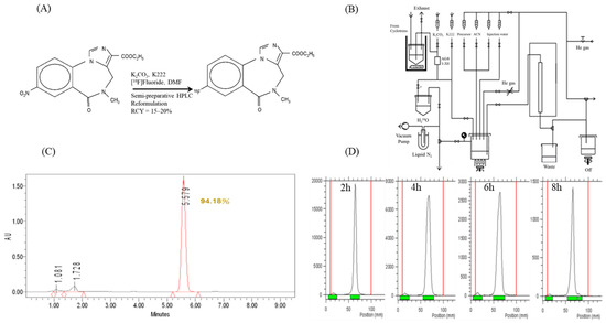 Previously, [18F]flumazenil synthesis was conducted via isotopic exchange of 19F for 18F, using flumazenil as the precursor during synthesis [40,41,42]. The development of nitro-flumazenil as a precursor has resulted in high specific activity, which is essential in brain receptor imaging studies. However, a long synthesis time of approximately 75 min has been reported when using the same precursor. Moreover, after radiosynthesis, the needed purification of [18F]flumazenil using semi-preparative HPLC can result in low specific activity, as it is time-consuming process (50 min), and the procedure has been difficult to automate, resulting 18F radioactive decay [43,44]. Our study represents a straightforward carrier-free nucleophilic radio-fluorination method, using an automatic synthetic technique with solid extraction purification to replace semi-preparative HPLC, based on a fully automatic radiosynthesizer labeled with nitro-flumazenil precursor (Figure 1A). The total synthesis time of [18F]flumazenil was 90 min, and the obtained [18F]flumazenil exhibited high radiochemical purity (radio-HPLC (>90%) and radio-TLC (>90%), in Figure 1C,D), although the radiochemical end-of-synthesis (EOS) yield was approximately 15–20% lower than the reference (30%) [43,44]. Overall, we report a very convenient method for obtaining adequate yields and radiochemical purity of [18F]flumazenil.