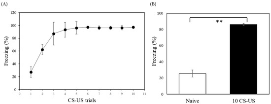 Analysis of freezing behavior in fear-conditioned and control rats. (A) The effect of the number of CS-US pairings. Fear-conditioned rats received 1–10 tone-foot-shock training, consisting of a 20 s tone (CS) of 80 dB, and a foot-shock of 1.2 mA (US) administered for 3 s. This study observed that increasing the number of CS-US pairings caused the animals to exhibit a higher freezing response. (B) The rats which received 10 CS-US presentations froze significantly more than control animals. The control group (Naive) showed without freezing than CS-US group presentated. Data points represent the mean values, and the error bars represent standard deviations. **, p < 0.001 (t-test).