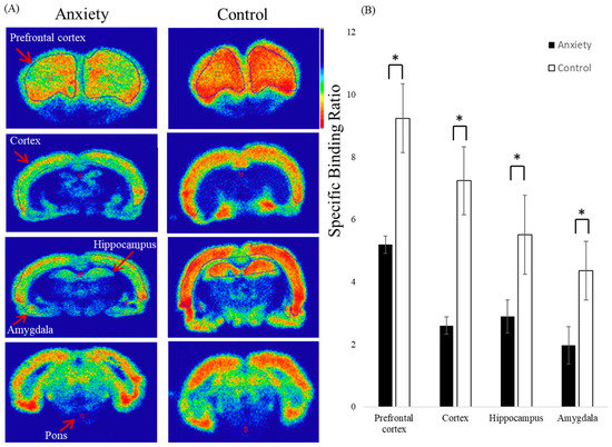 Ex vivo autoradiography of [18F]flumazenil in fear-conditioned (anxiety group) and control rats. The autoradiograms of sections were taken 30 min post-injection of [18F]flumazenil. (A) In comparison with control rats, the fear-conditioned rats displayed lower accumulation of [18F]flumazenil in the prefrontal cortex, cortex, amygdala, and hippocampus. (B) The normal rats displayed markedly higher specific binding ratios than the fear-conditioned rats in prefrontal cortex, cortex, hippocampus, and amygdala (p < 0.05, unpaired t test). Black = anxiety group, white = control group. (* p value < 0.05 compared to control group).