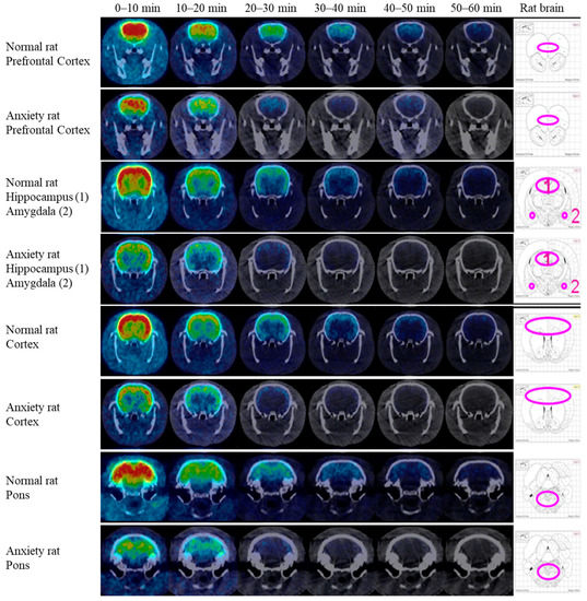 The regional distribution of GABAA receptors in the brain, as imaged by [18F]flumazenil PET, is shown in Figure 4. After injection of [18F]flumazenil, each time frame was observed in 10 min in both fear-conditioned rats and normal rats.