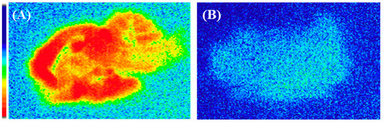 Ex vivo brain autoradiograms of [18F]flumazenil only (A) and [18F]flumazenil combined with 200 µg diazepam (BZR agonist) (B), after post-injecting, via the tail vein, [18F]flumazenil 37 MBq/0.2 mL for 30 min. (A) represents the binding of [18F]flumazenil to the high-density cortical regions of the brain, while (B) represents that the binding of [18F]flumazenil was blocked by the addition of diazepam.