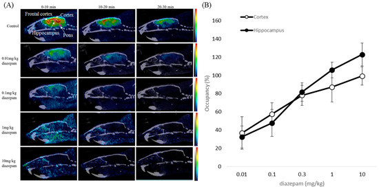 To further characterize the nature of GABAA receptor uptake, the effects of pre-treatment with 200 µg diazepam (BZR agonist) were studied in ex vivo autoradiography, and pre-treatment with 0.01–10 mg/kg diazepam for NanoPET/CT in vivo imaging. Pre-saturation studies have shown a high displaceable component for diazepam administration in the frontal cortex, cortex, amygdala, and hippocampus contrasted to [18F]flumazenil, indicating that the structural modification of [18F]flumazenil results will show in high affinity for GABAA/cBZRs (central benzodiazepine receptors) [23,30,31].