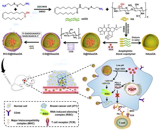 A few research reports have recently been published based on pH-sensitive micelles’ applications. Zeng et al. prepared mixed micelles from curcumin-hyaluronic acid conjugate (HC) and D-α-tocopherol acid polyethylene glycolsuccinate as carriers and dasatinib as the core. The mixed micelles were designed for co-delivery of curcumin and dasatinib for increased solubility and stability of the drugs and to increase the circulation time of micelles for an EPR effect. The system also utilized active targeting via the use of hyaluronic acid to the CD44 protein in tumor cells. The pH-sensitive ester bonds in the HC conjugate activated the micelles and release drugs in the tumor micro-acid environment. The co-delivery of curcumin and dasatinib from hyaluronic acid-based micelles effectively targeted CD4 overexpressed HepG2 cells and produced a synergistic effect. The micelles showed significant inhibition of tumor growth and reduced toxic side effects in a mouse solid tumor model of liver cancer [144]. A novel pH-sensitive drug delivery system for daunorubicin was created using poly (oligo (ethylene glycol) methyl ether methacrylate and 2-aminoethyl methacrylate hydrochloride (AMA) and 4-azibo benzyl methacrylate and 2-aminoethyl methacrylate hydrochloride. The micelles were with a particle size of 132 nm and showed 13 and 73% drug release at pH 5.0 and 7.4, respectively. The cytotoxicity against HeLa cells suggested its potential for enhanced cancer therapy. The pH-sensitive and charge-conversion micelles exhibited potential for use in cancer therapy [145]. The combination of Paclitaxel, Etoposide, and Rapamycin targets different pathways to kill cancer cells, but their low water solubility limits their clinical use. To overcome this, pH-sensitive polymeric micelles made of methyl PEG-pH-PCL polymer were developed to improve solubility and delivery to cancer cells. The pH-sensitive polymeric micelles display varying drug release behaviors based on the differential pH of tumors and healthy tissues. As the pH decreases, as in tumors, the release rate of each drug increases, resulting in improved drug levels in tumor cells. The micelles showed improved bioavailability of drugs compared to respective solutions. These drug-loaded monomethoxy PEG-pH-PCL micelles were therefore considered a beneficial option for gastric cancer treatment [146]. Lin et al. reported a pH sensitive micelle system based on O-(2-aminoethyl)-O′-methylpoly(ethylene glycol) 5000, 1-(3-aminopropyl) imidazole, and cinnamate onto polysuccinimide. The hydrophobic anticancer drug paclitaxel was successfully encapsulated within the polymeric micelles. Before being cross-linked in a low-pH environment, the drug-loaded micelles released the drug in a single burst due to the micelle-unimer transition of the polymer in the buffer solution. They demonstrated that at pH 7.4, the core cross-linked micelles released a relatively small amount of the drug, while the uncross-linked micelles released a significant amount of drug over time. This suggests that the drug circulation time can be increased, and premature drug release can be prevented by cross-linking the core of the micelles. At pH 7.4, the uncross-linked molecular state from the micelles did not provide enough protection for the paclitaxel in the core. As a result, even in physiological fluids at pH 7.4, the drugs could gradually be released from the un-cross-linked carriers before reaching the targeted cells. Drugs released too soon from uncross-linked micelle carriers in bodily fluid suggested the significance of developing micelles with cross-linked molecular states as drug carriers [147]. Song et al. developed a pH/reduction-responsive micelle for the simultaneous delivery of siPD-L1 and doxorubicin to increase the effectiveness of chemotherapy in treating cancer. The reduction-sensitive and CD44-targeting amphiphilic micelles (Hyluorpnic acid-ss-oleic acid, HAssOA) were created by joining oleic acid (OA) and hyluoronic acid (HA) with cystine. Then, doxorubicin-loaded micelles (D@HAssOA) were created by nanoprecipitating doxorubicin into the hydrophobic core of micelles. Electrostatic contact was used to coat positively charged cationic chitosan oligosaccharides (COS) on the surface of D@HAssOA in order to effectively deliver siPD-L1, as shown in Figure 2. Next, DOX and siPD-L1 co-delivering micelles (R/C/D@HAssOA) were created by electrostatic interaction loading siPD-L1. In weak acid and reduction (pH 5.0 + 10 mM GSH), doxorubicin and siPD-L1 release dramatically increased [108]. An amphiphilic triblock pH-sensitive poly(β-amino ester)-g-poly(ethylene glycol) methyl ether-cholesterol (PAE-g-MPEG-Chol) was reported to show an excellent drug release profile under different pH conditions. Doxorubicin was encapsulated into the polymeric micelles with a high drug-loading concentration. The in vitro doxorubicin release from the micelles was distinctly enhanced, with the pH decreasing from 7.4 to 6.0. Micelles exhibited excellent pH sensitivity. The release of doxorubicin was slow at a pH of 7.4. The cumulative release for the doxorubicin/polymer system was roughly 33% after 24 h, indicating that most of the drug remained in the micellar core. The doxorubicin release rate was significantly increased at pH 6.0. The drug-loaded devices showed regulated release dependent on pH change and with 35% of the drug released after 3 h and approximately 95% released after 24 h. The greater protonation of amino groups in PAE moieties under lower pH conditions may account for the loosened micelle structure. In addition, the increasing charge density on the micelle surface increased electrostatic repulsion between PAE units, which resulted in the disorganized micelle [148].