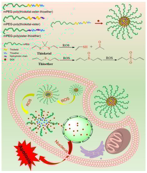 A few ROS sensitive micelles have been reported recently. For example, a dual-responsive micelle for the delivery of doxorubicin and a cyclopalladated anti-cancer agent was reported. In this micelle, the drugs were combined within the micelle’s hydrophobic core, and the micelle were decorated with an outer hydrophilic layer of PEG and β-cyclodextrin conjugate. The micelle was destabilized in response to high levels of ROS found in cancer cells or in an acidic environment, leading to the release of the drugs. The study demonstrated that the anti-cancer effects of co-delivery micelles were improved compared to free drugs in vitro [153]. Liang et al. reported the development of a ROS-responsive micelle for the co-delivery of dexamethasone and hypericin for photodynamic therapy of cancer. The micelles delivered dexamethasone to inhibit migration, invasion, and angiogenesis of vein endothelial cells, promoting the delivery of oxygen and drug-loaded micelles to the tumor site. Within the tumors, endogenous ROS partially cleaved the outer shell of the micelle to release the drugs, and an external light source was used to excite hypericin and produce ROS, leading to effective cell apoptosis. The upregulated ROS further cleaved the micelles, achieving a self-circulating burst release of hypericin and dexamethasone. This ROS-responsive platform can be used as a feasible strategy to combat cancers [154]. Sulfur-based polypeptides can show ROS-responsive structural changes, thereby providing ROS triggered release from the micellar systems. For example, a new selenium-based polypeptide with higher sensitivity to ROS-response has been developed so that they even respond to much lower levels of ROS in terms of triggered drug release. The micelles were prepared from Se-Benzyl-l-Selenocysteine N-Carboxyanhydride and methyl PEG-NH2. The amphiphilic copolymer was loaded with doxorubicin. These micelles selectively released their payload in tumor cells with ROS [155]. PEG biodegradable polymeric micelles with PLA, PCL, and PLGA hydrophobic blocks have been widely used as drug carriers due to their excellent biocompatibility and biodegradability [26,117,156,157,158]. Recently, a ROS-sensitive methyl poly(ethylene glycol)-poly(ester-thioether) micelles were developed and showed enhanced cellular uptake and anticancer efficacy, as shown in Figure 3. The ROS-sensitivity of the self-assembled micelles was investigated in the presence of different ROS reagents. Once the concentration of H2O2 was increased to 500 mM, the size of micelles was about 70 nm for 2 h and more than 500 nm for 4 h. It revealed that the micelles were more sensitive to high H2O2 concentrations. A similar size variation behavior of the micelles was observed in the other two ROS reagents of Fenton’s reagent and NaClO. From the size variation results, it could be concluded that the micelles were more sensitive to the ROS reagent. The methyl poly(ethylene glycol)-poly(ester-thioether) micelles showed the most efficient anticancer activity compared to methyl poly(ethylene glycol)-poly(thioketal-ester) and methyl poly(ethylene glycol)-poly(thioketal-ester-thioether) micelles [117].