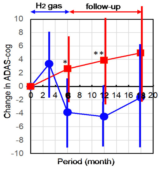 Change of ADAS-cog from the initial stage. Participants inhaled 3% H2 gas for 1 h, twice per day, for 6 months and were followed-up for 1 year without H2 inhalation. ADAS-cog was examined at the first 3 months (only H2 group), and every 6 months in the participants and untreated control patients, and the changes from the initial stage were averaged with standard deviations (error bars). Blue circles and red squares show the H2 group and untreated controls, respectively. * and ** indicate significances with p = 0.017 and 0.004, respectively (H2 group vs. untreated control group). Note that ADAS-cog was obtained independently in the physical therapy department, the staff of which did not know whether subjects were participants in this study or common outpatients. These results were reported to doctors via an electronic chart system in a blinded manner.