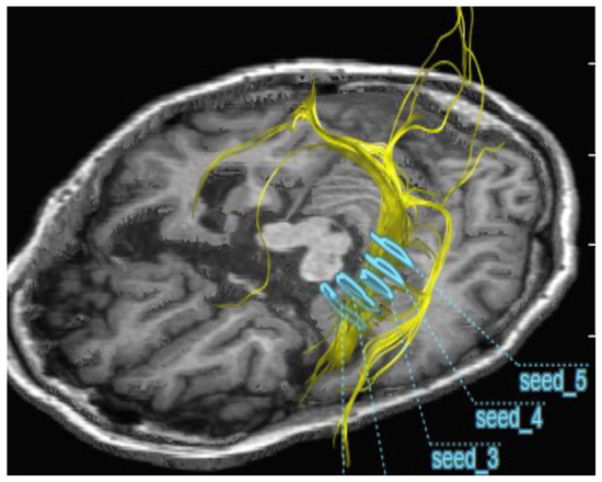 Brain MRI was examined in the radiology department as an objective assessment. Five seed points were set at the volumetric measurement sites where the neuronal bundles passed through the entire hippocampus (Figure 2). Digital tractography imaging was performed using Neuro3D with the GRAPPA technique. DTI was obtained with FA values of 0.1 and 0.2. The tract size was calculated from the pixel number of the tract images, and the number of pixels in the tract was calculated using ImageJ software.