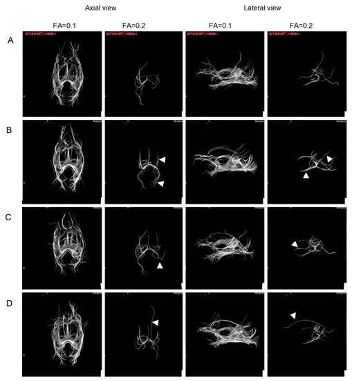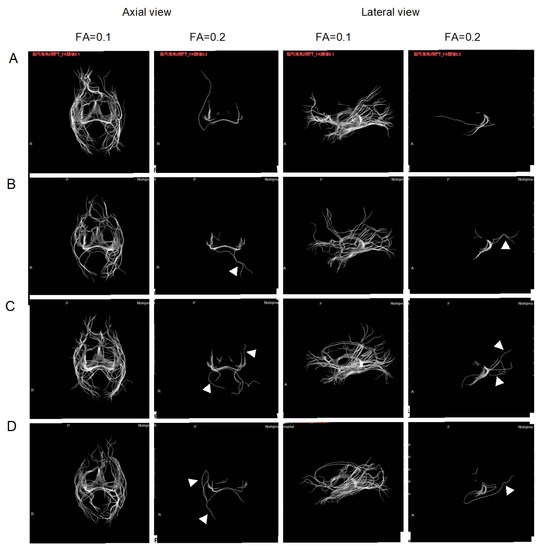 Fractional anisotropy (FA) values reflect the density of active axons within bundles, with lower values corresponding to lower active axonal density. To evaluate the diffusivity of water along the neuron bundles as neuron integrity, diffusion tensor imaging (DTI) was conducted with different FA values at 0.1 and 0.2 for the entire hippocampal region [17,18,19]. The neuron tract size visualized at FA = 0.2 reflects the higher neuronal integrity, while the visualized neuron tract reflects the entire neurons at FA = 0.1, which is less sensitive to neuronal integrity. Figure 2 visualized the neuron bundles that passed through the entire hippocampus at five seed positions (Figure 2).