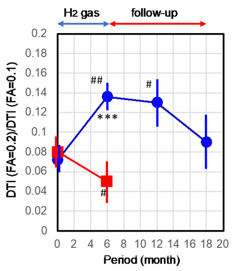 Quantitative analyses of the time course of the diffusion tensor imaging (DTI). Participants inhaled H2 gas for 6 months and were followed-up for 12 months without inhalation of H2 gas. DTI was examined at the indicated times for participants and untreated control patients. The pixel numbers of the corresponding neuronal bundle tracts in FA = 0.1 and FA = 0.2 were obtained for the right and left hemispheres with lateral and axial views. Each value in FA = 0.2 was divided by that in FA = 0.1, and these normalized values from patients with 4 images were averaged with the standard errors (error bars). Blue circles and red squares show the H2 group and untreated controls, respectively. *** indicates significance with p = 0.001 vs. untreated group. ## and # in the H2 group indicate significances with p = 0.0036, and p = 0.011, respectively, vs. the initial stage of the H2 group. # in the untreated control group indicates significance with p = 0.024 vs. the initial stage of the control group.