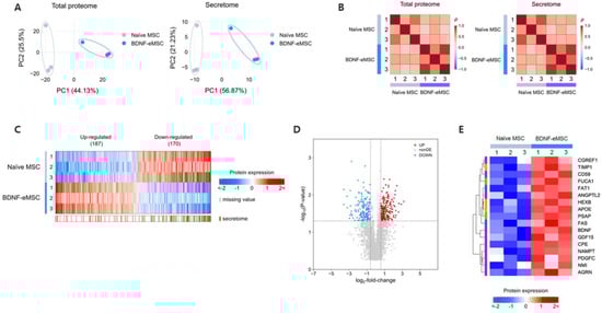 Figure 2. Proteomic analysis of BDNF-eMSC supernatant. (A) The principal component analysis (PCA) shows the first two principal components of data regarding their relationship in total proteome or secretome. (B) Correlation analysis shows replicates of the same pipeline cluster at both total proteome and secretome levels. (C) Heatmap of differentially expressed proteins (DEPs) in the total proteome (red and blue) and secretome (brown). (D) Volcano plot analysis shows DEPs of the total proteome. Red dots indicate significantly up-regulated genes, and blue dots indicate down-regulated genes. (E) Heatmap of significantly up-regulated proteins in secretome of BDNF-eMSCs compared to naïve MSCs. Analyzed DEPs are selected by BDNF-eMSCs enriched gene ontology biological process (GOBP) analysis: neurogenesis (purple), metabolism (green), or both (yellow).