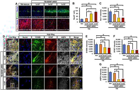 Figure 4. A single administration of BDNF-eMSCs reduces neuronal death and glial activation after TBI. (A) Representative images showing the expression of NeuN (green) or Iba-1 (red) in the CA1 stratum pyramidal (SP) or stratum radiatum (SR) of the ipsilateral hippocampus 14 days after TBI, respectively. Scale bar, 10 μm. (B,C) Quantification of the number of NeuN+ neurons (B) or immunofluorescence intensity of Iba-1 (C), as determined in the CA1 SP or SR of the ipsilateral hippocampus after TBI, respectively. Data are mean ± SEM; n = 4 per group. * p < 0.05 vs. vehicle-treated TBI group; # p < 0.05 vs. BDNF-eMSCs (1 × 105)-treated TBI group (Kruskal–Wallis test followed by Bonferroni post hoc test: (B): Chi-square = 11.691, df = 3, p = 0.009; (C): Chi-square = 8.846, df = 3, p = 0.031). (D) Triple-label confocal micrographs of S100 calcium-binding protein B (S100B, green), glial fibrillary acidic protein (GFAP, red), and aquaporin-4 (AQP4, gray) in the CA1 SR of the ipsilateral hippocampus at 14 days after TBI. Scale bar, 10 μm. (EG) Quantification of the immunofluorescence intensity of S100B (E), GFAP (F), or aquaporin-4 (G), as determined in the CA1 SR of the ipsilateral hippocampus after TBI. Data are mean ± SEM; n = 4 per group. * p < 0.05 vs. vehicle-treated TBI group; # p < 0.05 vs. BDNF-eMSCs (1 × 105)-treated TBI group (Kruskal–Wallis test followed by Bonferroni post hoc test: (E): Chi-square = 11.355, df = 3, p = 0.01; (F): Chi-square = 11.51, df = 3, p = 0.009; (G): Chi-square = 11.664, df = 3, p = 0.009).