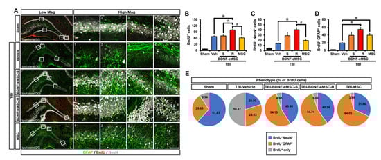 2.5. Repeated BDNF-eMSC Administration Increased Adult Hippocampal Neurogenesis and Gliogenesis after TBI