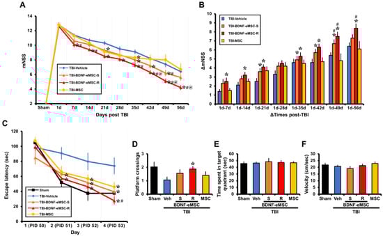 Figure 7. Behavioral effects of repeated administration of BDNF-eMSCs after TBI. (A) The mNSS was determined in rats for the entire experiment period after TBI. A score of 18 means that all tasks failed; a score of 0 indicates that all tasks were successfully completed. Data are mean ± SEM; n = 10 from each group, * p < 0.05 vs. vehicle-treated group, # p < 0.05 vs. MSC-treated group, @ p < 0.05 vs. single BDNF-eMSCs (BDNF-eMSC-S)-treated group (Repeated measure ANOVA; Day: F = 238.907, p < 0.001; Group: F = 8.806, p < 0.001; Day × Group interaction: F = 2.405, p < 0.001). (B) Changes in mNSS (ΔmNSS) were evaluated at various time intervals between day 1 and multiple pre-determined time points thereafter. Data are mean ± SEM; n = 10 from each group, * p < 0.05 vs. vehicle-treated group, # p < 0.05 vs. MSC-treated group (Repeated measures ANOVA; Time: F = 74.780, p < 0.001; Group: F = 12.041, p = 0.008; Day × Group interaction: F = 14.363, p < 0.001). (C) MWM performance. Escape latency of acquisition trial for 4 consecutive days starting post-injury day (PID) 50. Data are mean ± SEM; n = 10 from each group, * p < 0.05 vs. vehicle-treated group, # p < 0.05 vs. MSC-treated group (Repeated measure ANOVA; Day: F = 50.079, p < 0.001; Group: F = 12.455, p = 0.001; Day × group interaction: F = 2.752, p = 0.015). (D) MWM platform crossing. (E) Time spent in the target quadrant. (F) Velocity. Data are mean ± SEM; n = 10 from each group, * p < 0.05 vs. vehicle-treated group.