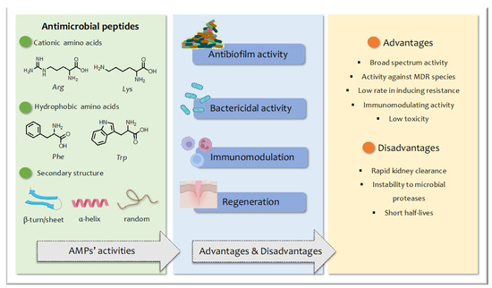 Schematic representation of advantages and disadvantages of AMPs and their structural features and biological activity.
