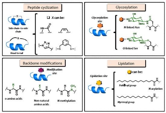Other strategies include (i) PEGylation [39,40], which allows for greater solubility and stability in aqueous solutions while reducing renal clearance [41]; (ii) glycosylation involving carbohydrate conjugation, which broadens peptide diversity by extending their properties and functions [42]; and (iii) lipidation involving the covalent attachment of fatty acids, which affects peptide activity through several mechanisms [43,44].