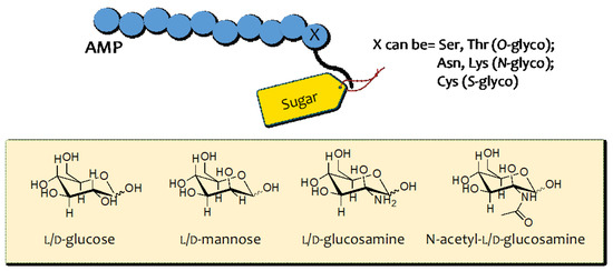 From a chemical point of view, the development of glycosylated peptides involves covalently linking glycans to a specific side chain of the amino acid residues present in the peptide sequence. Depending on the functional group implicated, glycosylation can be classified into four groups: N-glycosylation, O-glycosylation, C-glycosylation, and S-glycosylation [47]. In addition, the glycan composition, structure, and length determine the type of glycosylation. A variety of sugar moieties, including l/d-glucose, l/d-mannose, l/d-glucosamine, and N-acetyl- l/d-glucosamine (Figure 3), can be used and linked based on the designed AMP to improve its functionalities. As early as 20 years ago, several O-linked glycosylated and proline-rich AMPs derived from insects were identified such as diptericin, drosocin, formaecin, lebocin, and phyrrorricin [48]. Therefore, glycosylated AMPs represent only a small group of AMPs with broad-spectrum activity.