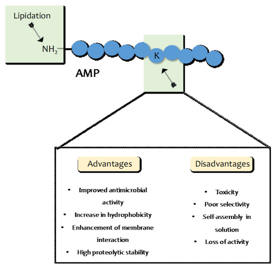 Another strategy to improve the antimicrobial potency of AMPs without causing structural modifications to their properties is lipidation, which involves the attachment of a fatty acid moiety to N-terminal residues or lysine side chains [84,85]. The incorporation of lipid tails of different lengths enhances the hydrophobicity of AMPs and confers better membrane interaction, better permeability, and protection against enzymatic proteolysis (Figure 5) [86,87,88]. It is likely that the improved potency is correlated to the length of the acyl chain, which also influences their pathogenic specificity [88] and enhances the interactions between the bacterial cell membrane and the fatty acid conjugated on the peptide. As acyl chains grow in length, there is an increased tendency for self-assembly in an aqueous solution, which determines a loss of peptide interaction with bacterial or fungal membranes.