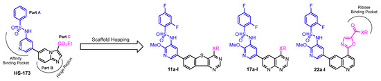Based on the co-crystal structures of the lipid kinase PI3Kα and structures of some known PI3K/mTOR dual inhibitors, it could be found that the structures mainly consisted of three parts (as shown in Figure 2): part A for the affinity binding pocket, part B for the hinge binding pocket, and part C for the ribose binding pocket. Parts A and B were essential to the activity, and the optimization of part C could improve the metabolic stability and oral bioavailability. The available results suggested [14] that when the structure of part A was 2,4-difluoro-N-(2-methoxypyridin-3-yl) benzenesulfonamide, it had the strongest PI3K inhibitory activity. Therefore, the optimization was mainly in parts B and part C.
