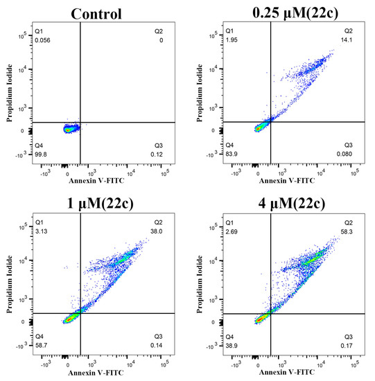 Figure 4. Flow cytometry analysis of apoptosis via Annexin V-FITC/PI staining after treatment with compound 22c at indicated concentrations for 24 h in HCT−116 cells.