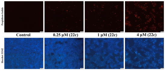 Figure 6. Analysis of the survival and apoptosis of HCT-116 cells induced by 22c via Hoechst 33342/PI staining. Normal cells show weak red fluorescence and weak blue fluorescence, while apoptotic cells show weak red fluorescence and strong blue fluorescence, the necrotic cells show strong red fluorescence and strong blue fluorescence.