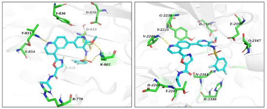 In the affinity binding pocket, the oxygen atoms of methoxy and sulfonyl formed conservative hydrogen bonds with Lys802; the N atom on the pyridine ring exhibited hydrogen binding with Asp810, Tyr836, and Asp933 through a water molecule. Then, NH of sulfonamide formed a hydrogen bond with Asp933 again. It is very rare to ever report these kinds of multiple hydrogen interactions in the binding pocket.