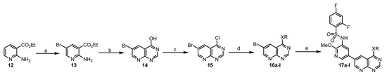 For the second type, the synthesis of 17a–l was shown in Scheme 2. Arylester 12 was brominated and further cyclized with formamide to obtain 14, which was further converted to 17a–l using the above method.