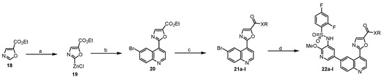 For the third type, the synthesis of 22a–l was shown in Scheme 3. 18 was deprotonated with LiHMDS and converted to the organic zinc 19 in THF. 19 was brought to the key intermediate 20 by coupling with 6-bromo-4-iodoquinoline via Negishi reaction [22], which was similarly transformed into 22a–l.