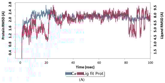 100 ns MD runs were used to estimate the RMSD and RMSF for the complicated reference and 6i analog forms. The ligand’s binding can prevent the protein from unfolding and stabilize it [65]. To better comprehend the conformational changes brought on by ligand contact, the RMSD record of the main protease response before and after docking of the 6i triazole derivative, which found equilibrium within 20 ns, is shown in Figure 8 (up for the reference drug, down for 6i). In the MD simulation, the target protein was confirmed to be stable at RMSD 20, which is a respectable value for protein structures that demonstrate the complex stability.