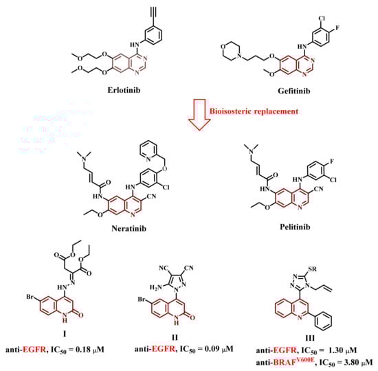 In medicinal chemistry, nitrogen heterocycles are crucial structural components. The chemical and biological uses of quinoline, one of many heterocyclic compounds, have been studied by numerous research groups [,]. The FDA recently approved quinazoline derivatives, such as gefitinib and erlotinib (Figure 1), as EGFR inhibitors for treating non-small cell breast and lung cancers [,,]. In addition, Thr766 in the EGFR pocket forms a water-mediated hydrogen bond with the nitrogen atom at position 3 of the quinazoline core [,]. New quinoline derivatives, such as pelitinib and neratinib, which are potent EGFR inhibitors, were developed through the bioisosteric replacement of the quinazoline core with a quinoline ring (Figure 1) [,,,,]. The bioisosteric substitution did not require water molecules to facilitate the interaction with amino acid residue Thr766 [].